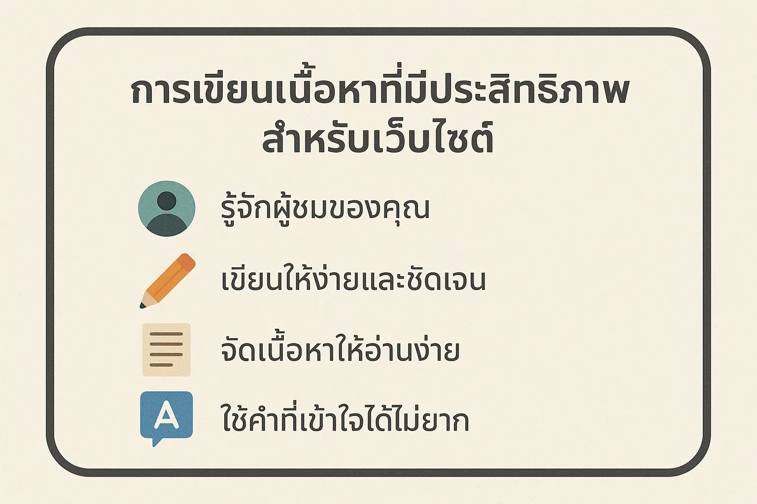 - บทความเชิงความรู้ (How-to / Guide) → เช่น “วิธีเขียนเนื้อหาเว็บไซต์ให้ขายได้”