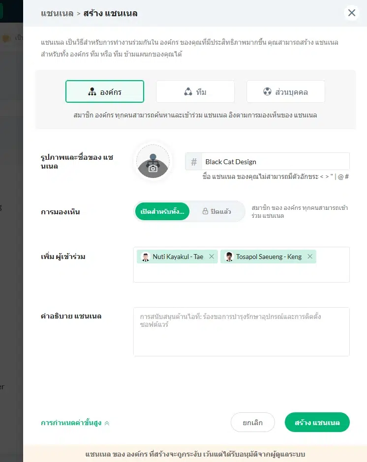 • การมองเห็น –  การมองเห็นช่องสามารถเป็น  “เปิดสำหรับทุกคน”  หรือ  “ปิด” ได้ตัวเลือกนี้ใช้ได้เฉพาะเมื่อสร้างช่องขององค์กรหรือทีมเท่านั้น ตัวเลือก “เปิดสำหรับทุกคน” อนุญาตให้ทุกคนเข้าร่วมได้ และสามารถค้นหาช่องได้ ตัวเลือก “ปิด” อนุญาตให้สมาชิกเข้าร่วมตามคำเชิญ และไม่สามารถค้นหาช่องได้