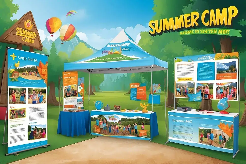 วัสดุประเภท fabric graphics หรือกราฟิกผ้าตึง มีข้อดีคือช่วยให้บูธดูสะอาด เรียบ และสื่อภาพแบรนด์ได้ชัดในพื้นที่ใหญ่ โดยมักใช้ร่วมกับเฟรมอลูมิเนียมเพื่อสร้างผนัง แบ็กดรอป หรือ lightbox แบบน้ำหนักไม่มาก